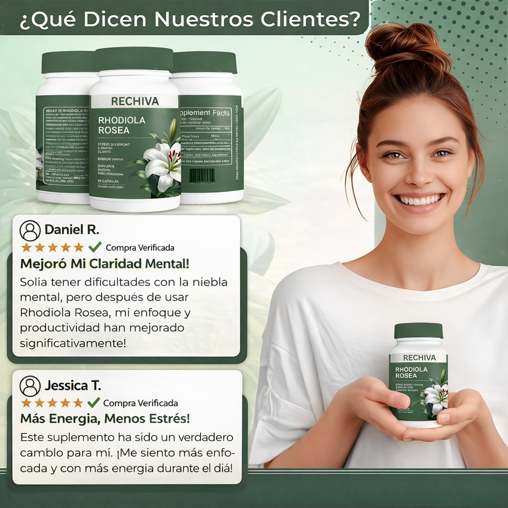 No. Rechiva® es 100% libre de cafeína. La energía que sientes proviene de la respuesta natural de tu cuerpo a la Rhodiola, no de estimulantes. Sin nerviosismo, sin bajón.